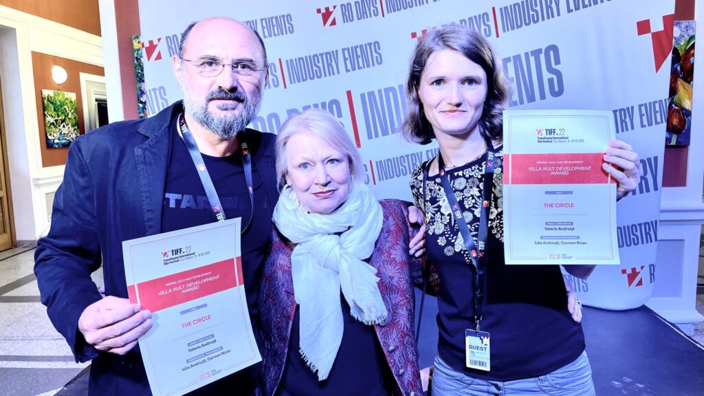 The Circle received the Villa Kult Prize at Transilvania Pitch Stop (TIFF) 2023, from Renate Roginas, director of the Villa Kult Residency Programme in Berlin, Germany.